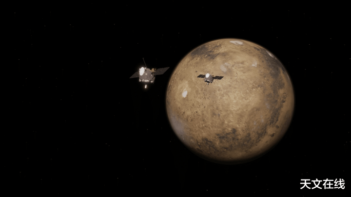 这张艺术家渲染图展示了 ESCAPADE 探测器在火星附近的景象。美国国家航空航天局